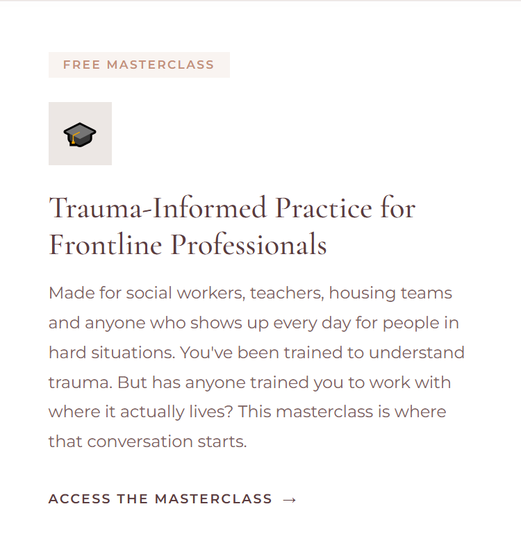 Whether you are just starting out in trauma-informed practice or ready to go to the deepest level of this work, there is a place for you in the pathway. Eighteen practitioners have already come through as beta testers across all three levels. The feedback has been extraordinary.