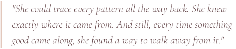 And still. Every time a good opportunity came along, every time a relationship started to feel safe, every time she got close to what she actually wanted, something would happen. She would pull back. Sabotage it. Walk away before it could go wrong.